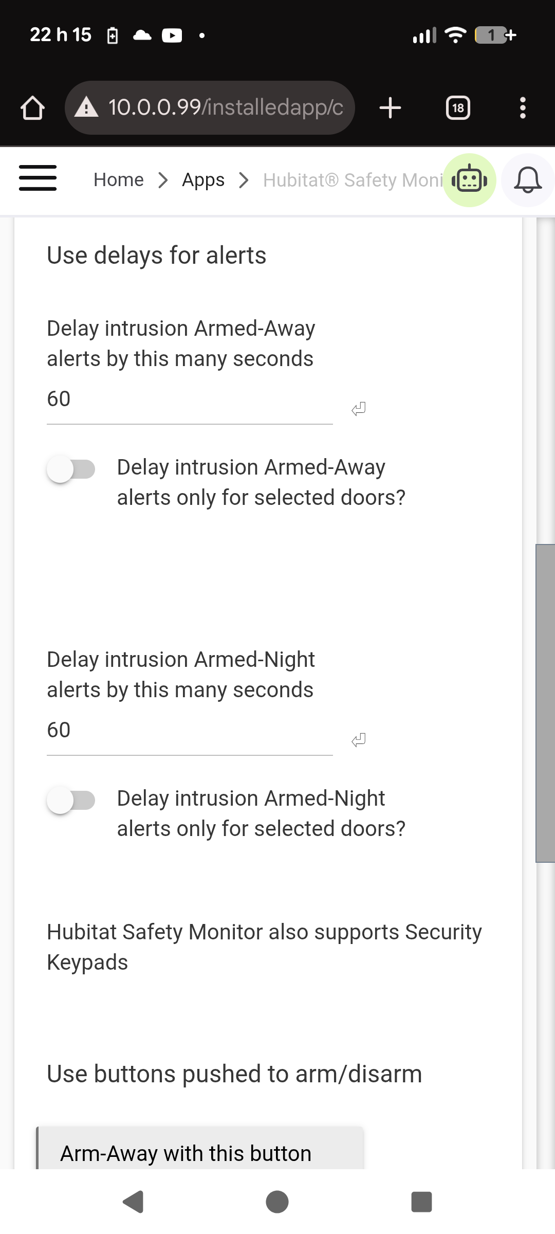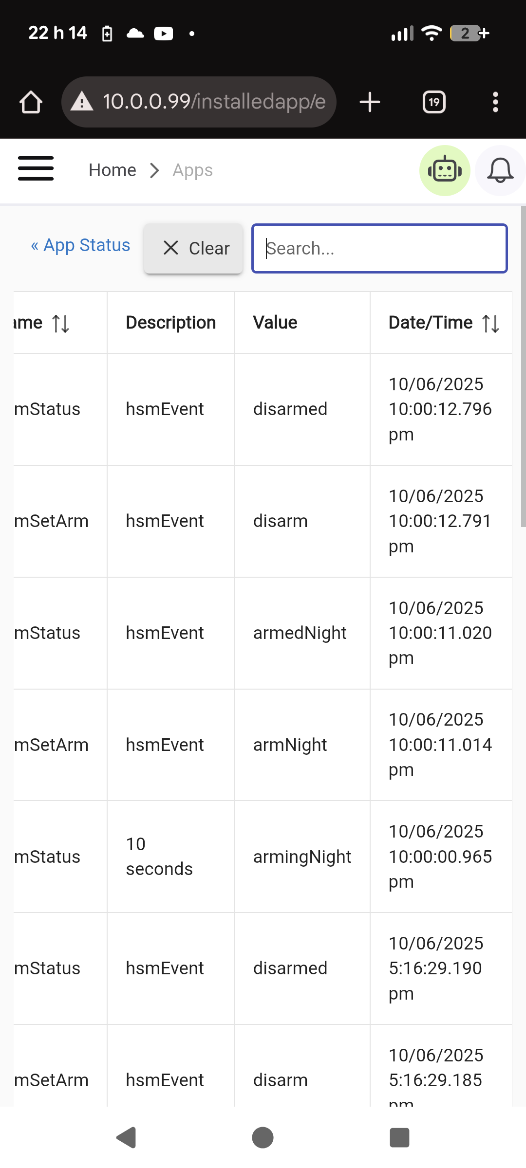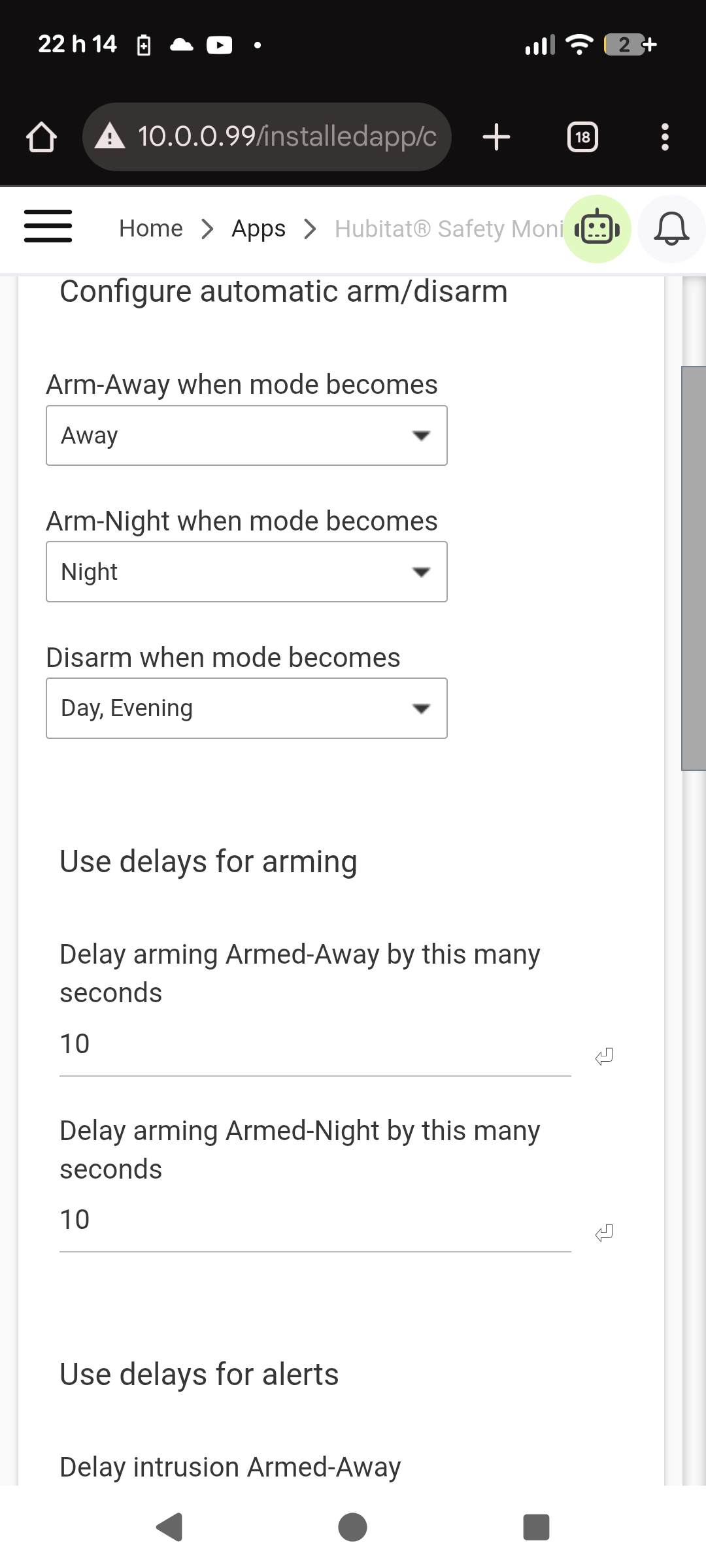 Hi! So I am having a problem to set the correct state in the HSM. At 10pm the "Integrated Mode Manager" changes the mode to night mode. HSM changes to armedNight but right away it changes again to disarmed as you can see in the logs below.