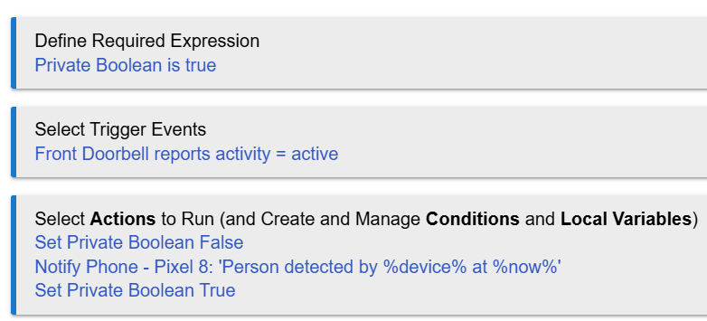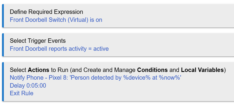 If we are not at home, or in our night mode, then Hubitat Safety Monitor will sense the activity on the virtual motion sensor and trigger an intrusion (which has more drastic notifications than the above).