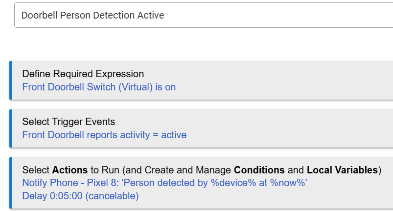 I added the Delay action below and set it for 5 minutes. However, I keep getting notifications on my phone in like 2 or 3 minutes. This checks for the Kasa doorbell person detection being active. Can someone explain to me why it's not at least 5 minutes before I receive a notification?