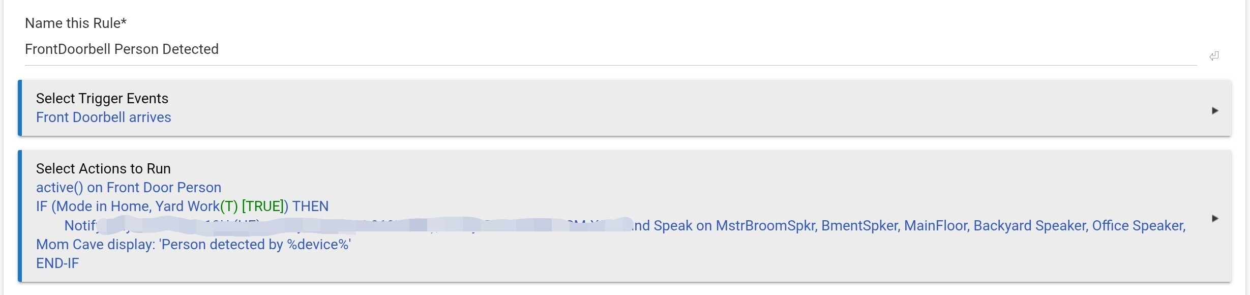 If my current mode is "Home" or "Yard Work" then it notifies my and my wife's phones, and also plays a message on speakers throughout my house.