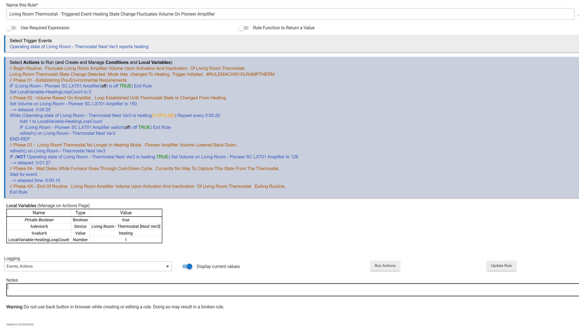 It started with this rule not triggering. This was an existing rule that has been in place for several years. The devices involved in this rule were not involved in the change. What is interesting here is that; although the rule will not trigger, if I press the run action one the thermostat is in the heating mode (to satisfy the while/repeat condition) it will continue to run / loop until the thermostat is no longer heating and then ends just like is should. It just does not initially trigger like the other trigger issues I am seeing.