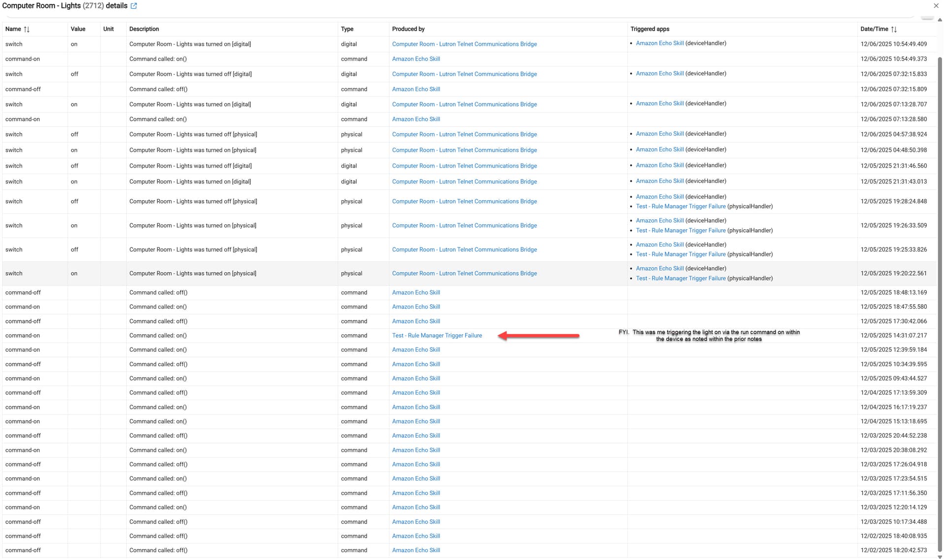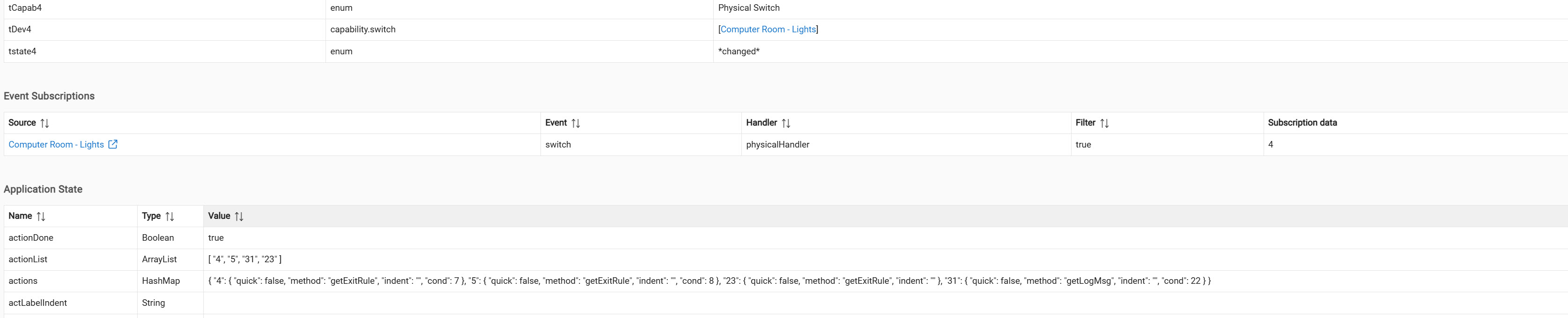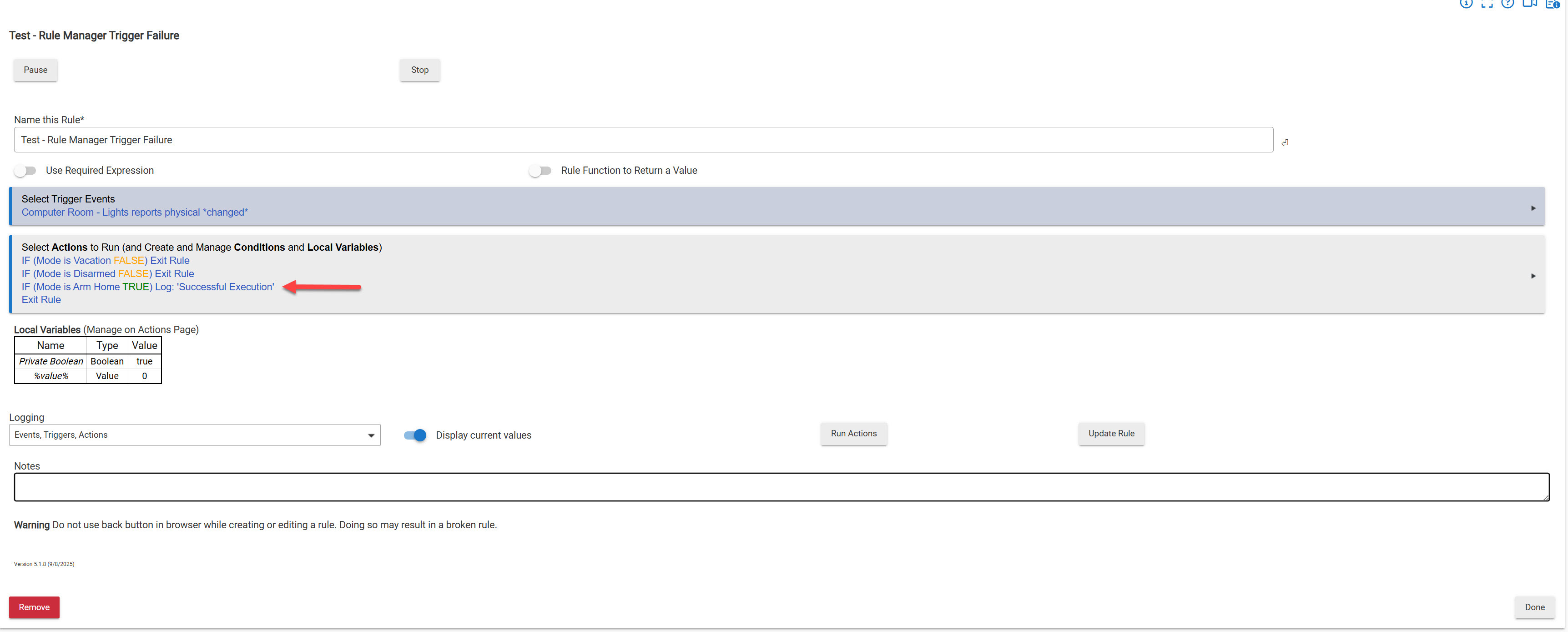 This rule was created after the updates. The device used WAS one of the updated devices. The objective / action of the rule is to write to a message to the log upon successful trigger (when the computer room light state is changes).