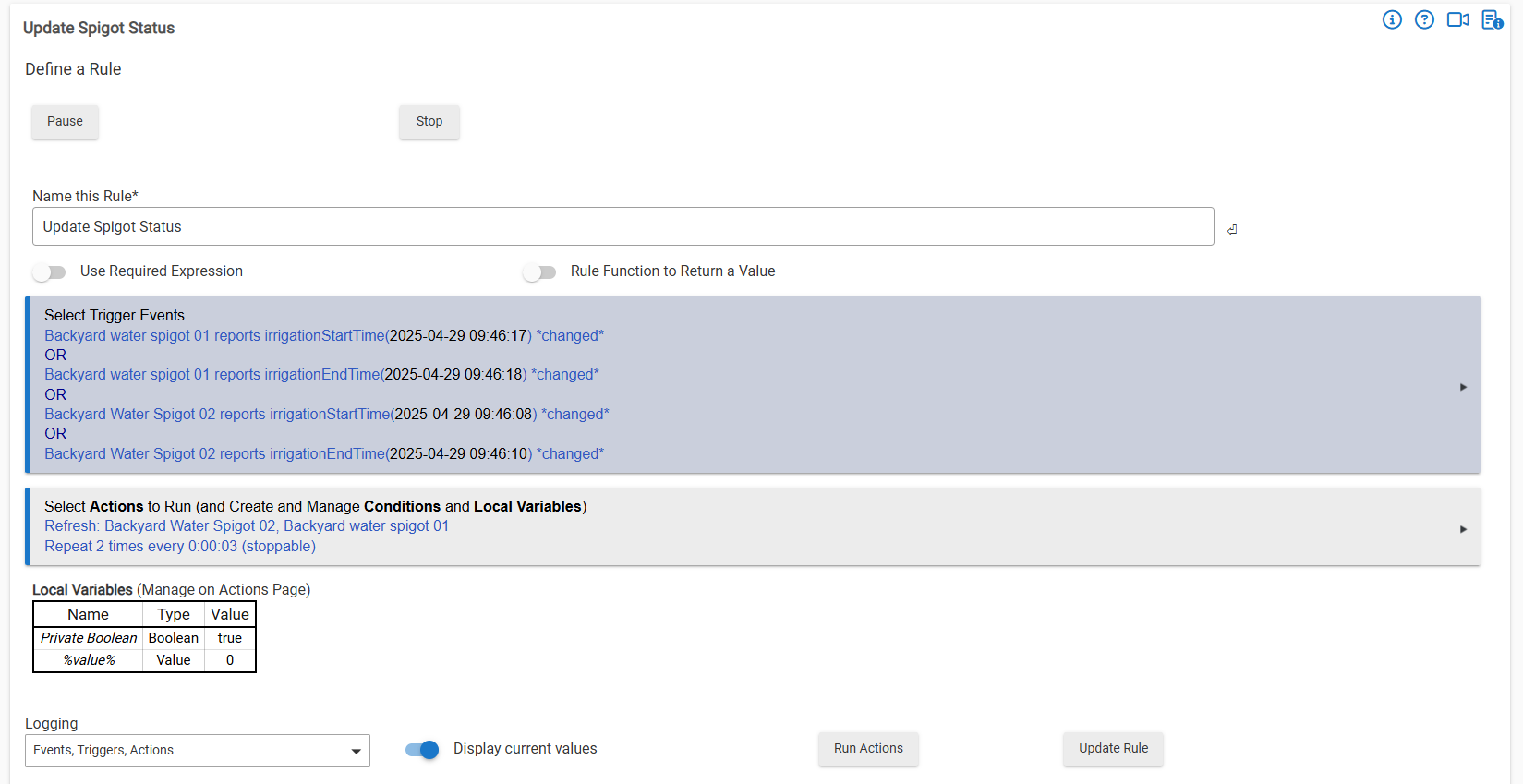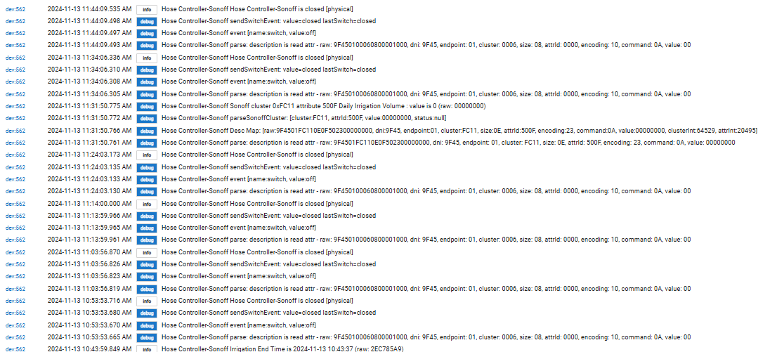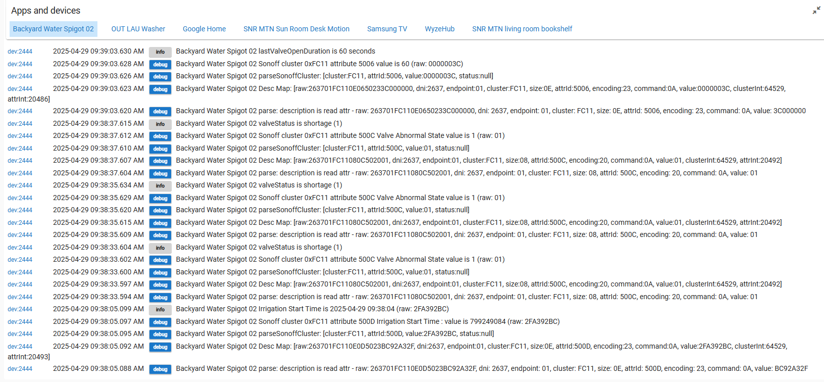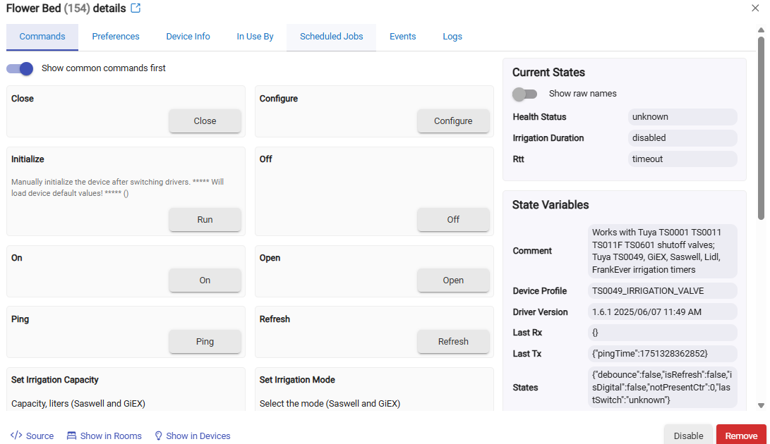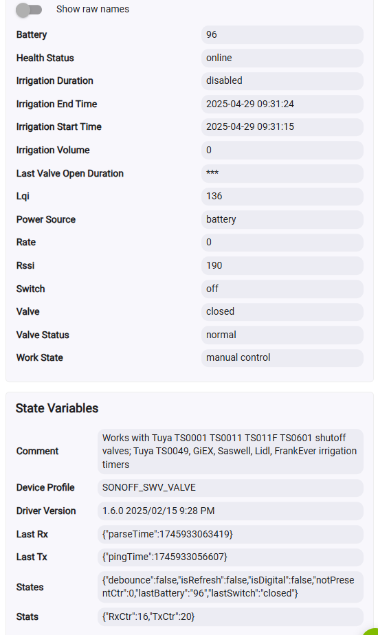 Flower Bed Deleted attributes: weatherDelay, batteryVoltage, valve, switch, timerState, rate, irrigationVolume, timerTimeLeft2, valve2, healthStatus, rtt, irrigationDuration, valveStatus2, battery, irrigationEndTime, valveOpenThreshold, irrigationStartTime, timerTimeLeft, workState, valveOpenPercentage, irrigationCapacity, lastIrrigationDuration, checkInterval, lastValveOpenDuration, powerSource, rssi, waterConsumed, valveStatus, lqi,