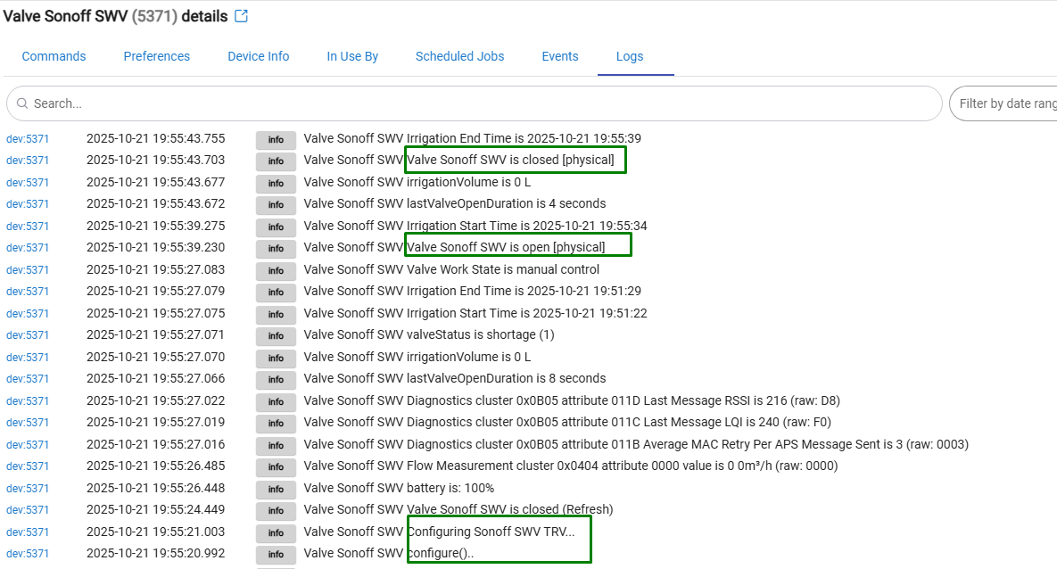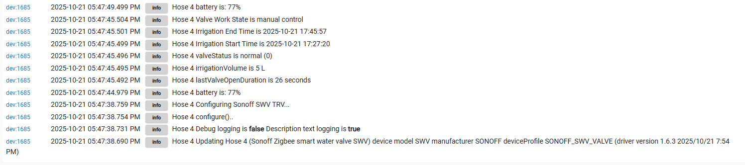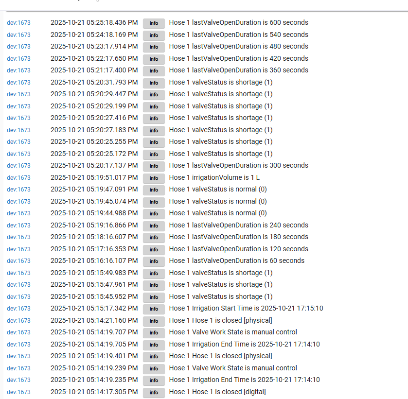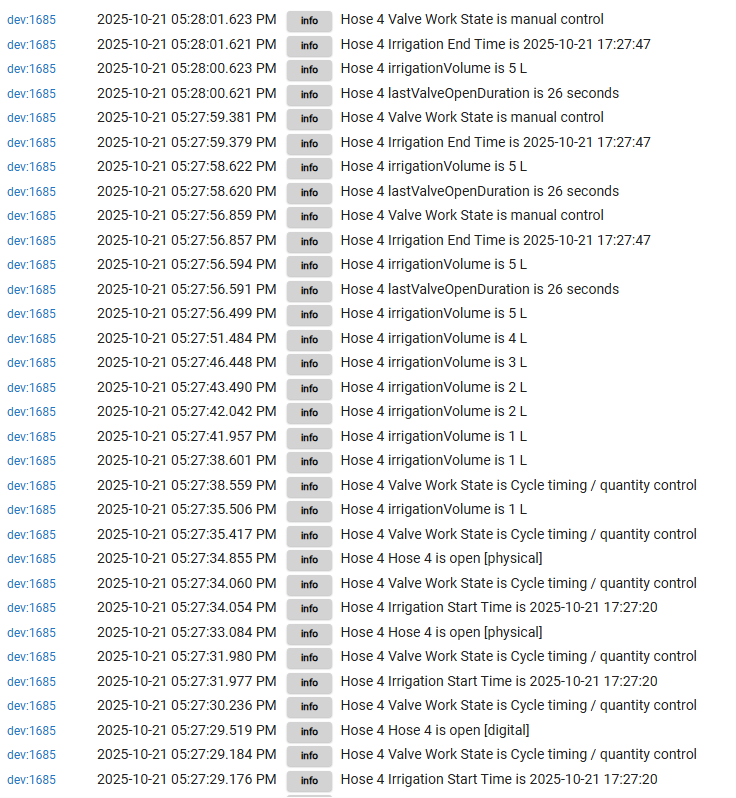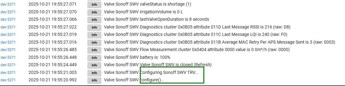 This is what I see in the Info logs after saving the Preferences and then manuallo opening and closing the valve :
