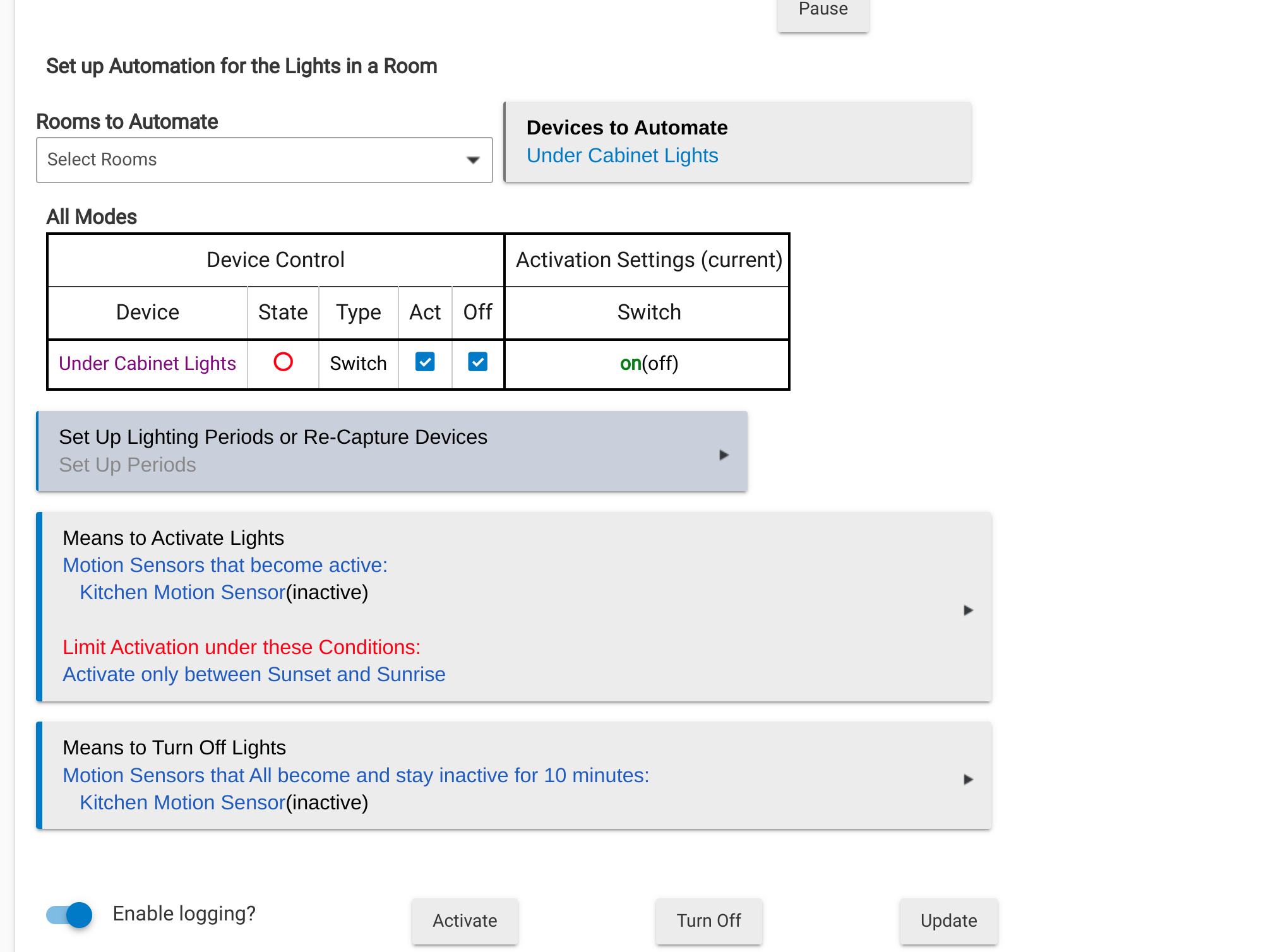 Simply put I have a simple setup in RL that turns on/off some under cabinent lights based on motion if it is between sunset and sunrise. It seems to work well, but this logging doesn't make sense.