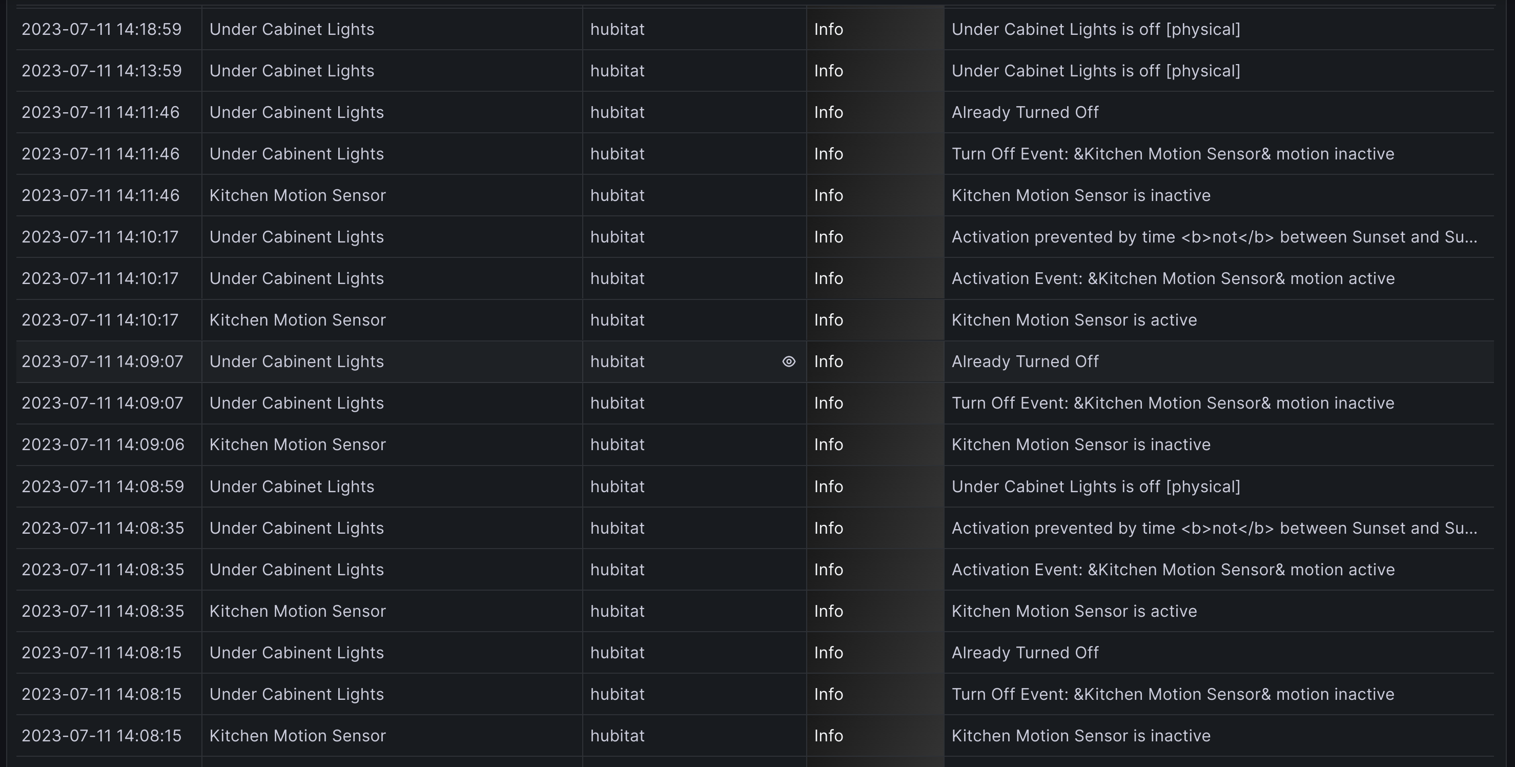 This is pulled over from my syslog output, but it is the same as what is found on the hub. What is confusing and concerning to me is that it looks like even though the activation is blocked by needing it to be between Sunset and Sunrise this logging shows some activity during the day when activation is prevented. I wouldn't be surprised to see a message from the sensor tha triggers it to save it is active, and then the message saying that activation was prevented. What is concerning is you can also see a bunch of messages about "Turn off Event" and then Already turned off. These are also confusing as they don't follow the timing setup for the turn off configuration.