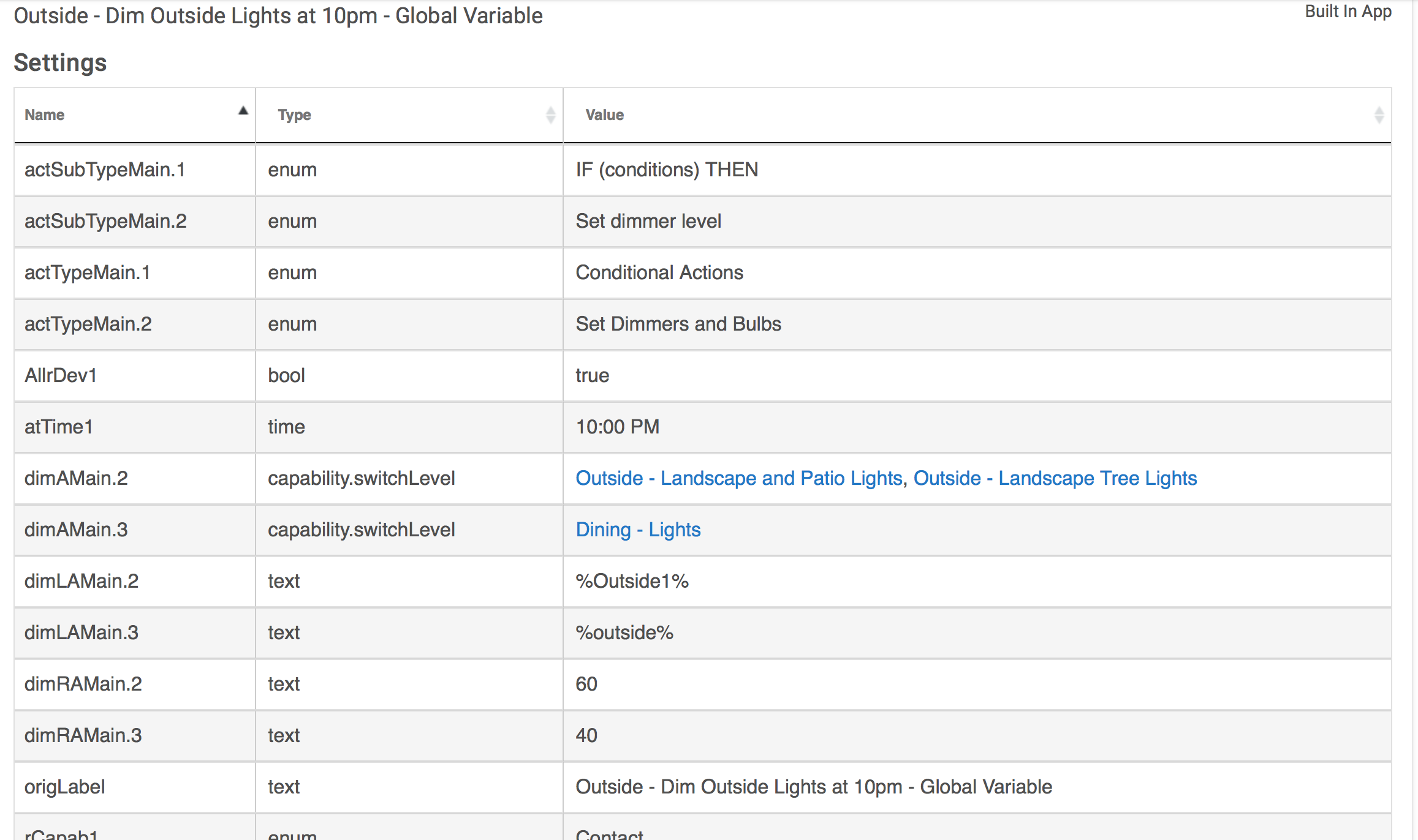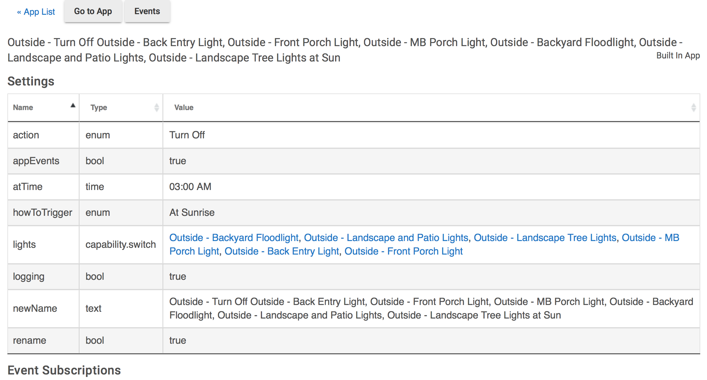 You can see that the system is sending the sunrise event. The App Status page is the gear icon in the app (upper right) on the gear left of the app name in the Apps list.