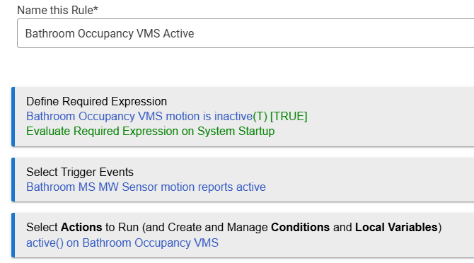 This example rule is triggered when Occupancy VMS (this is virtual device) becomes active, waits for all 3 MS becomes inactive for the certain time and once condition is met deactivates Occupancy VMS. Occupancy VMS is a part of many other bathroom automations rules.