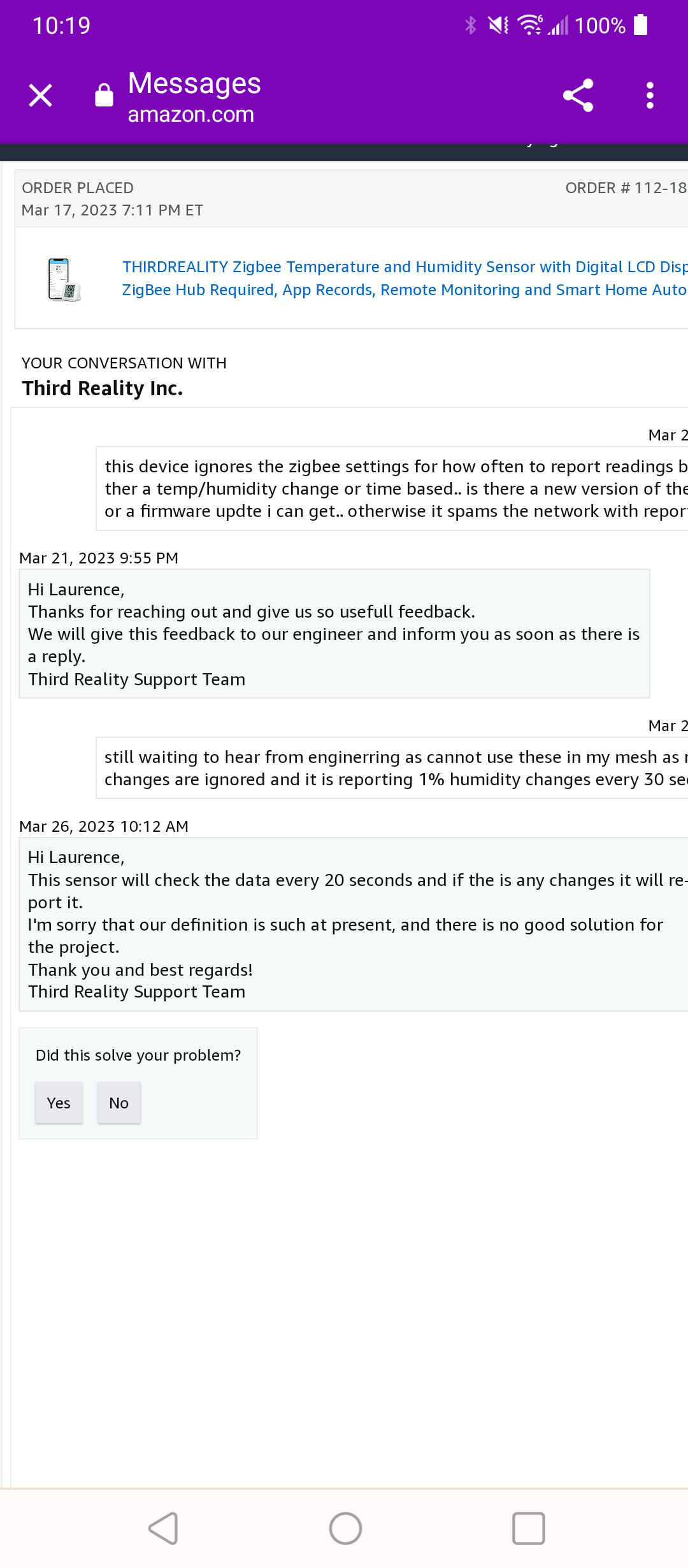 With the ThirdReality, it pretty much reports what is on the display. When the display changes it reports, plus maybe every 6 minutes with no changes. The display had temp in F to the nearest tenth, but reports to the nearest hundredth. RH is to the nearest whole number. Nothing I've done in the generic driver or misc. other drivers changed what it does; it has a mind of its own, lol.