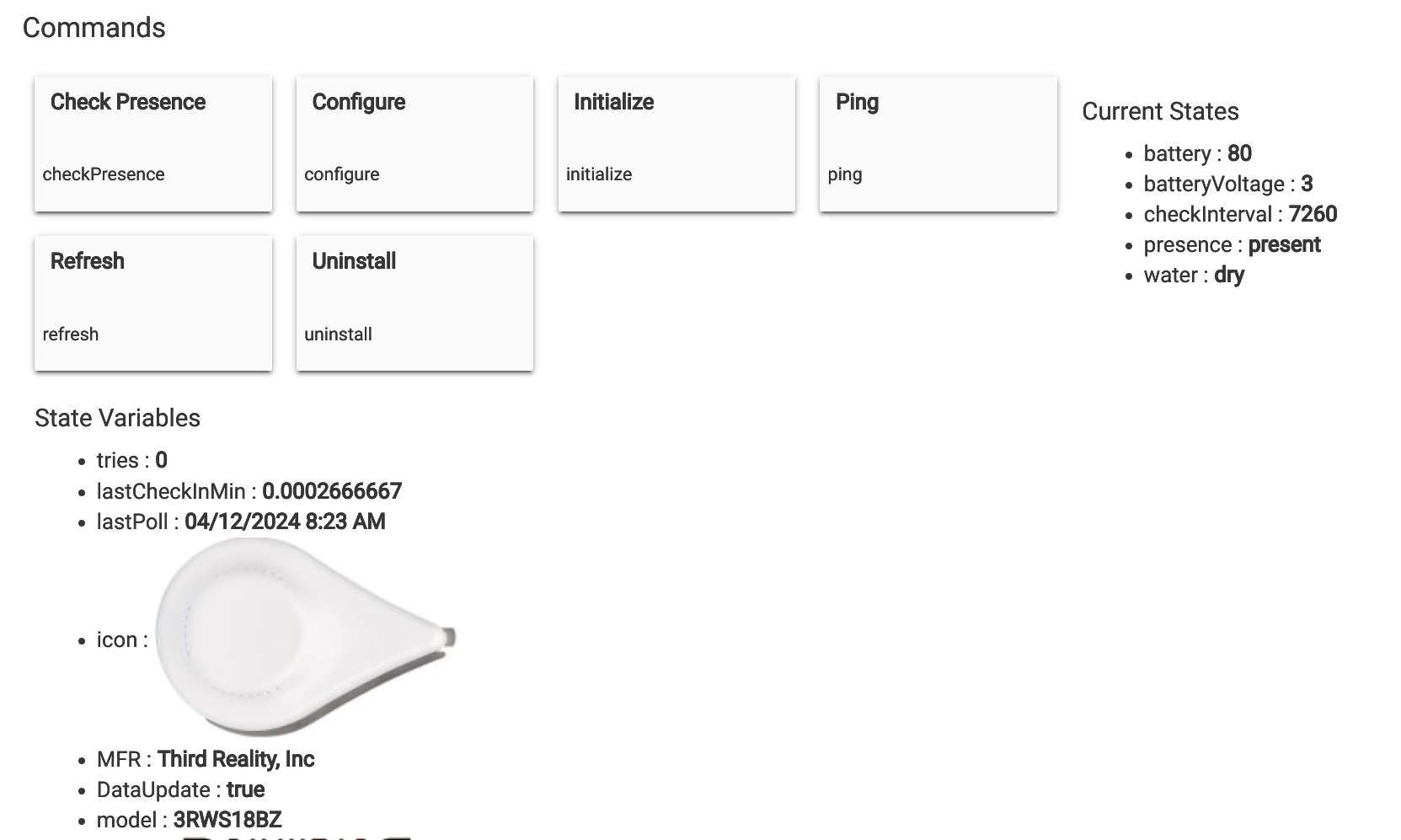 With the Third Reality driver I'm not seeing a battery report. However, they log "water" wet/dry hourly which satisfies device activity check. On the device page battery and voltage are reported. I have them set up in dashboard tiles and battery as well as wet/dry is displayed. Additionally, battery seems to increment in 10% intervals, five are at 80, one at 90 and one at 100 which seems reasonable based on install date. The good news is they don't all read 100.