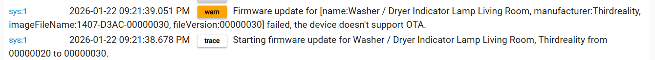 I was going to update my devices firmware and the Third Reality RGBW bult when I click the update firmware button it says that it is going to update to the newest firmware but then it gets canceled saying the device doesn't support OTA updates. Below is a screenshot of the logs.