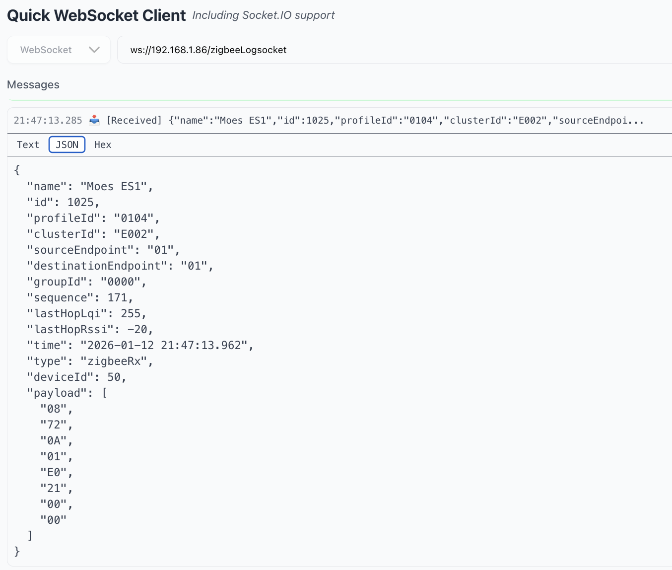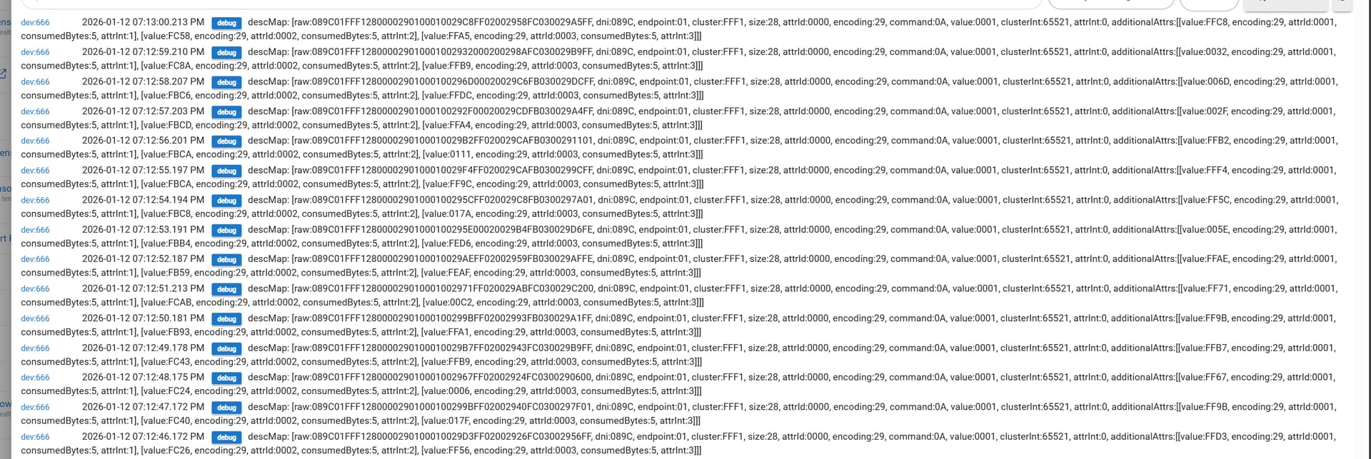 {"name":"Dryer","id":30944,"profileId":"0104","clusterId":"FFF1","sourceEndpoint":"01","destinationEndpoint":"01","groupId":"0000","sequence":72,"lastHopLqi":255,"lastHopRssi":-60,"time":"2026-01-11 13:14:24.231","type":"zigbeeRx","deviceId":534,"payload":["18","09","0A","00","00","29","01","00","01","00","29","6D","00","02","00","29","DA","FB","03","00","29","99","FE"]}