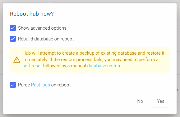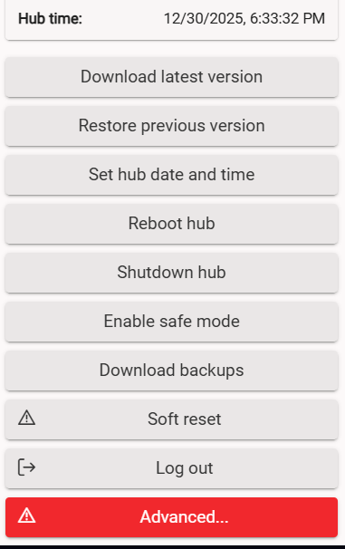 - Erases: Hub settings, device list, custom code, rules, and apps.