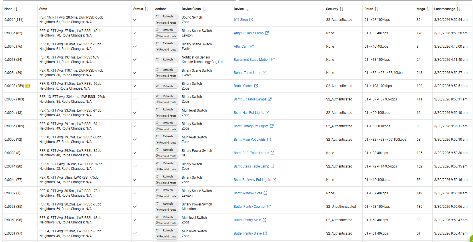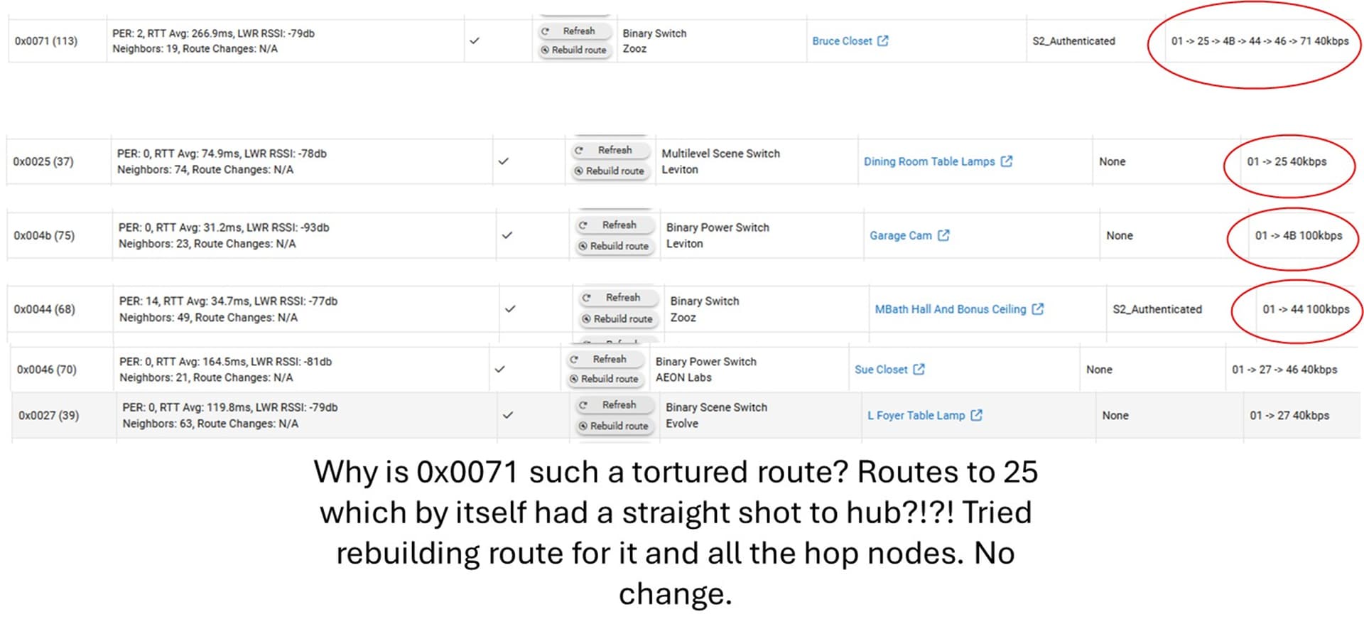 I also can't reconcile the duration variation across devices. FR Nook Lamp (9013ms), Powder Rm Hallway (8232ms), and Foyer Main (7860ms) are all direct routes to the hub. RSSi and PER is nothing unusual. I cant fathom why the long delays..