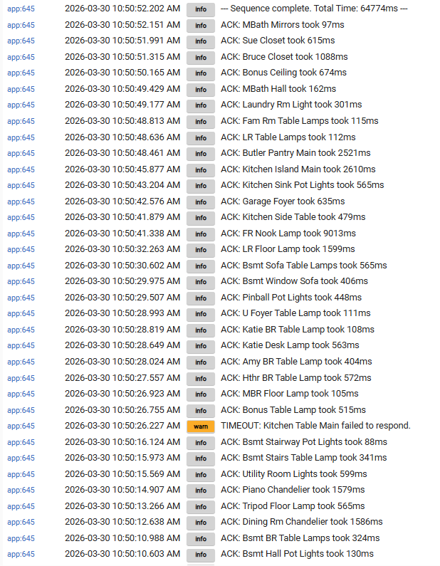 I created an app to sequentially turn on a large number of lights. It waits until the ACK of the prior device before sending the next command in the list. The idea was to avoid flooding the ZWave network with a bunch of near simultaneous commands. The app writes to the log the time duration from command sent to ACK for each device and then the end to end duration of all the devices at the very end. Large variation of ACK durations even those with direct hops.