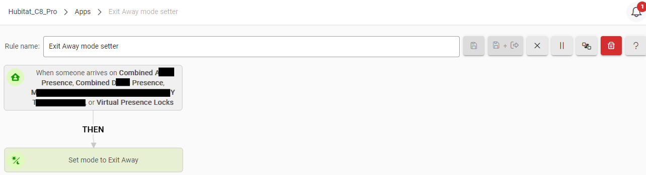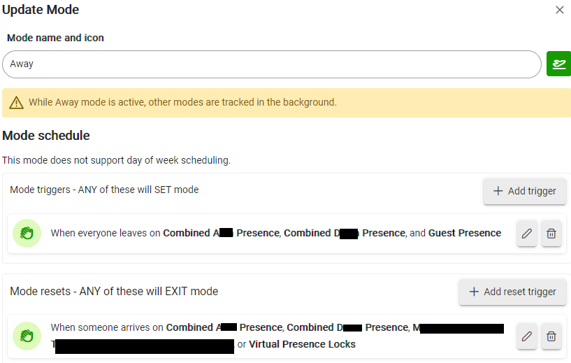 Here you can see that 'Virtual Presence Locks' is still in use by Exit Away mode setter even though it was not on the list of devices on the previous screen when I clicked the 'Save' icon. The same is true for all the other devices. If I got back to Settings -> Modes, the list of devices in 'Mode resets - ANY of these will EXIT mode' is unchanged.