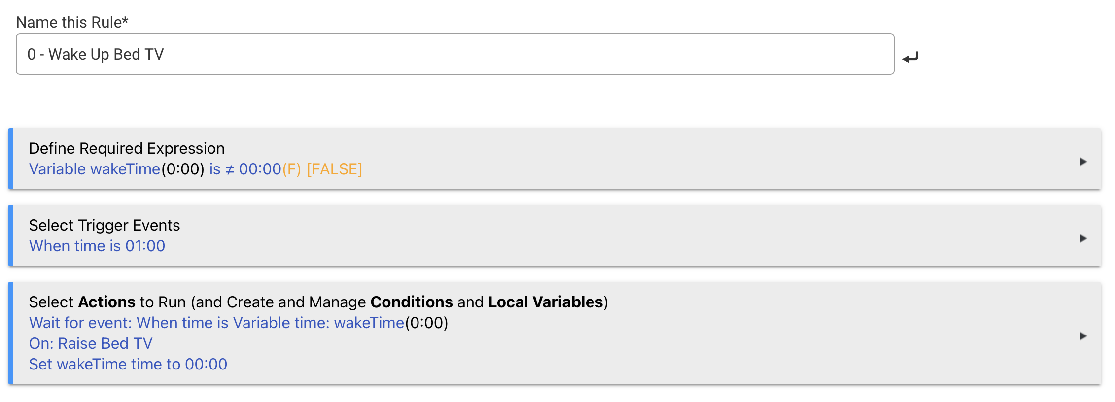I've set up the following rule and it works great. Tapping the variable connector on one of my HD+ dashboard brings up the time selection wheels and I set the wake up time. At 1 AM my rule is triggered only if the variable time is not midnight. The rule waits until the variable time and lifts the bed TV, then importantly sets variable time back to midnight, ensuring that the rule will only trigger if I set a wake up time on the dashboard before going to bed each night.