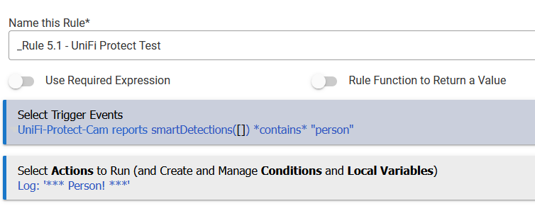 Yes, I set up a trigger event for each camera similar to what you shared for which I want to detect a person or a vehicle. Once that triggers, lights turn on. All was very straight forward once you pointed out where to find the smart detection variable. That was all I was looking for.