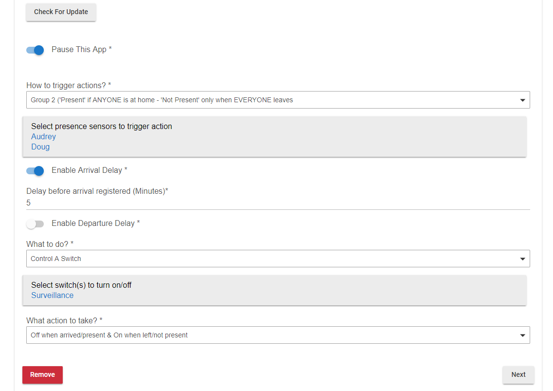 Setup just like you posted and when 1 of us leaves I see the sensor count decrease. When we’re both gone the switch is set and HSM is triggered to AWAY Mode.