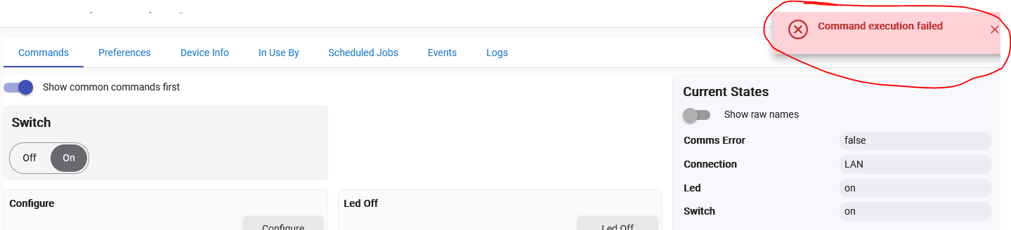 In the above example, I switched the switch on. The switch status changed to ON, the log files (even for devices that allow enhanced debug logging) show no errors, the device physically functions as it should.