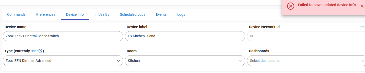 A similar error is displayed when changing the device Type; again it appears to be happening with every device:
