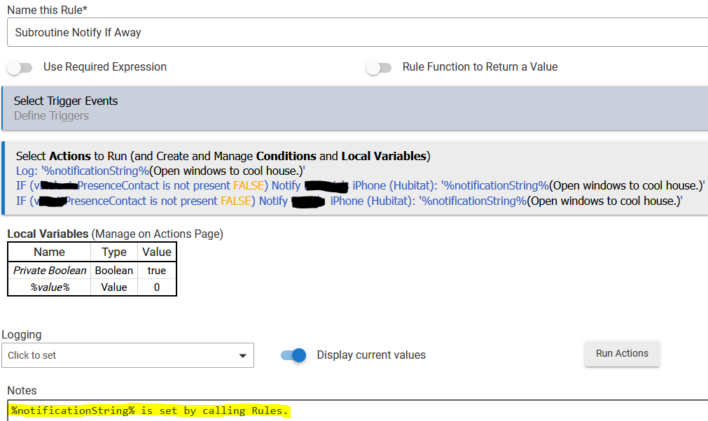 I have several other rules that create notification messages. The rule mentioned above is somewhat complex and I didn't want to duplicate that code in every place I needed to send a notification. However, since HE doesn't have any formal concept of subroutines the issue was how to pass an arbitrary string (in this case, the notification message) from one rule into another. I could only think of two ways: