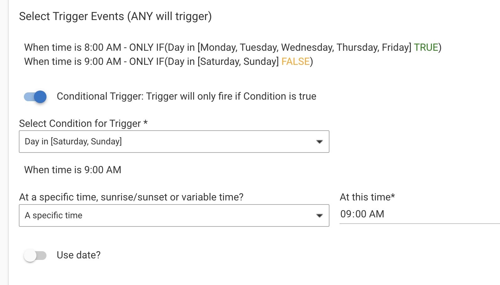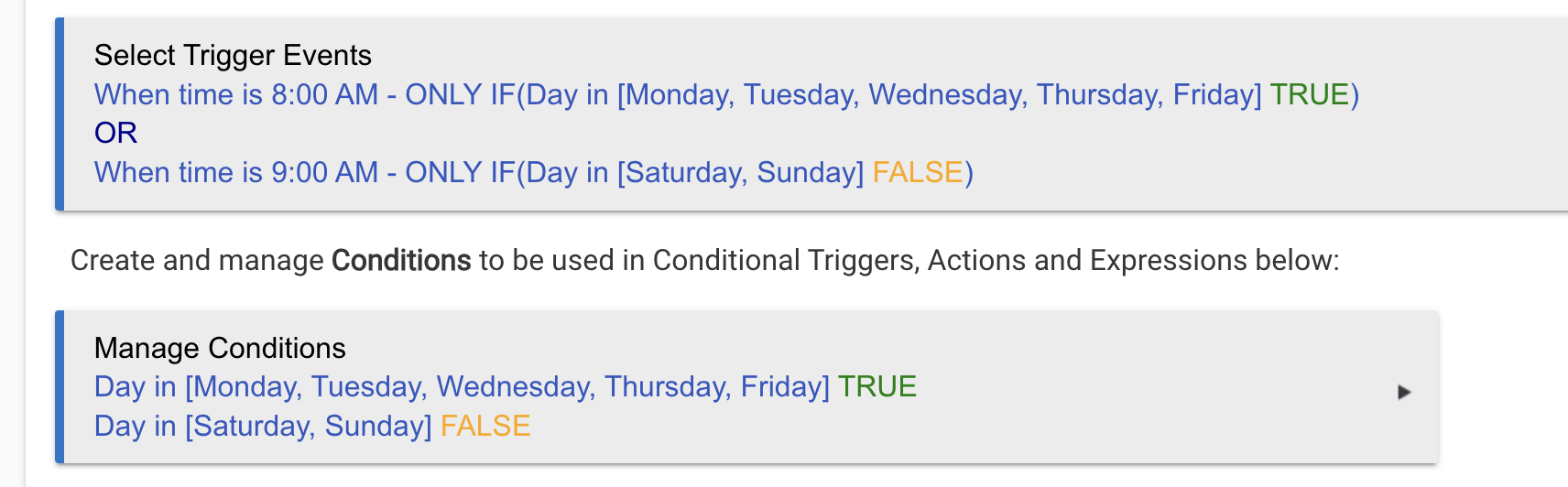 Initially the condition (Day in week Sat Sun) remains showing in use in 'Manage Conditions'. However once I go back in to the rule and click done it changes to not in use.