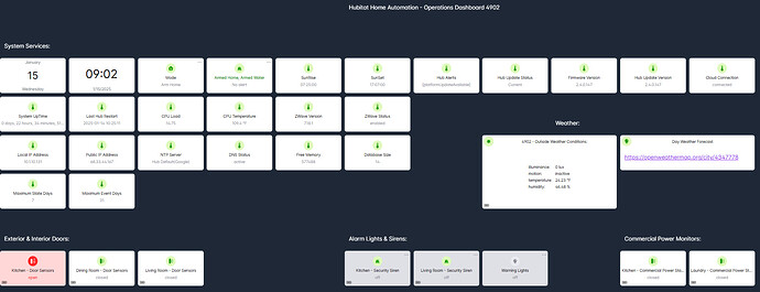 Using the hubinformation driver I setup a series of virtual drivers under the "System Services" section Easy Dashboard formatted for a windows desktop layout [shown below]. Using those exact same virtual drivers I put them in similar layout for an iPad [shown below].