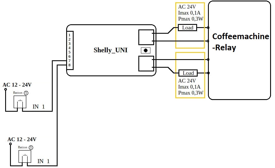 a quick question from my side. I'm playing around with my coffee machine. Right now, If managed to get the shelly uni onto the coffee machine and turn it on, which was pretty easy. The old switch stayed in place, so I can turn it on and off using the shelly or the original button. The only problem I have right now, is when I use the button, the is no updated status in the app or my HE. To get this going, I was thinking about connecting the button onto the shelly. When I got it right, I can use position 7 & 8 to switch the potential free relays (see picture). So connecting everything this way should give me the status update. So far right? Two more things which are bothering me right now are: