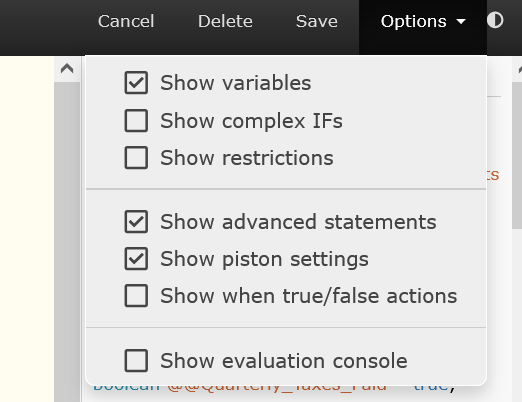 Thanks for the screenshots! I haven't used piston settings in a long time but I think that may be normal. For me it enables a "settings" line above the piston code that you can click to configure the piston name, description, and automatic state message: