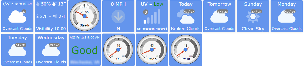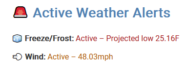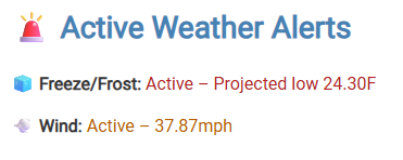 Active Weather Alerts (Freeze, Rain, Wind) All user configurable. -
