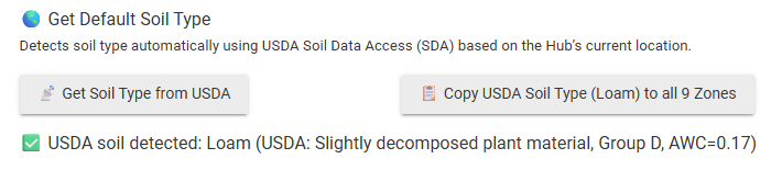 - Automatic Soil Type Detection. Not sure where your soil lies between loam, clay, and everything in between. One button will do a lookup at the US Department of Agriculture for your lat/lon and let you know: