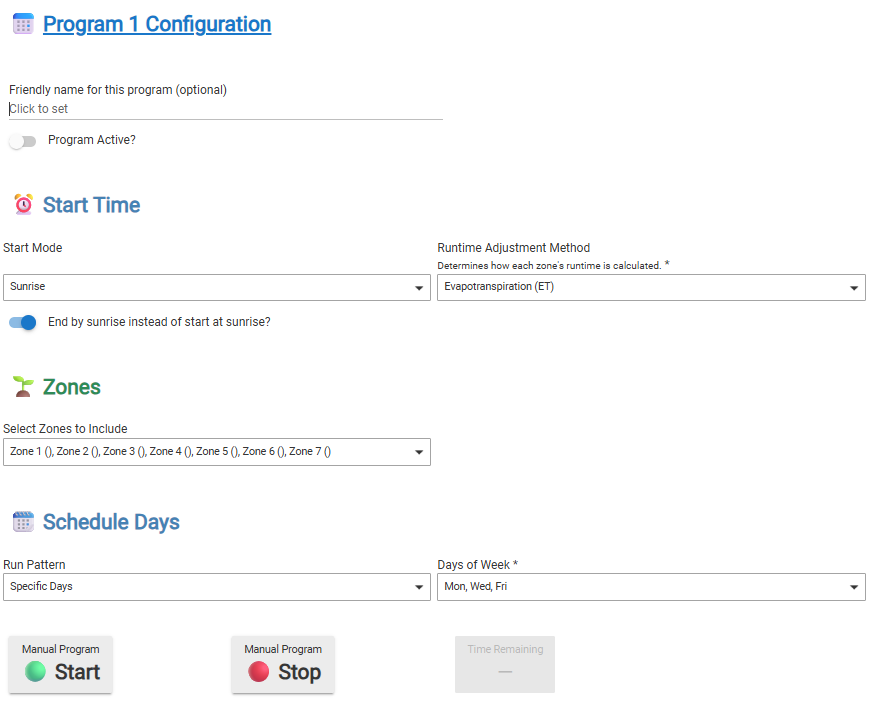 - Each program supports per-zone ET, Seasonal, or Base-Only runtime logic.