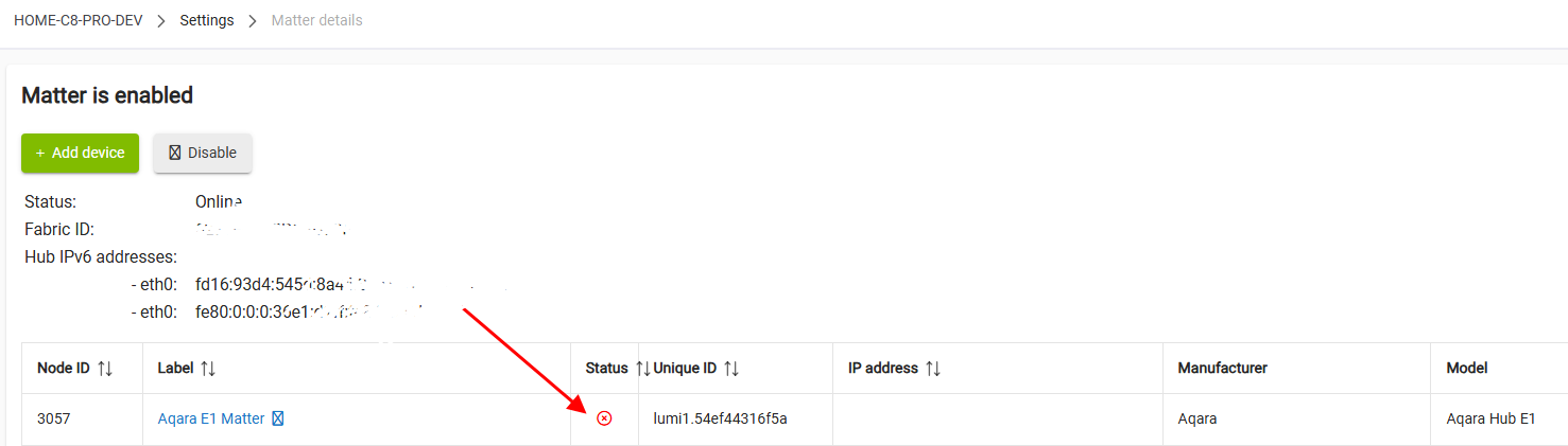 Check Settings -> Matter details : is the status of the device OFFLINE ?