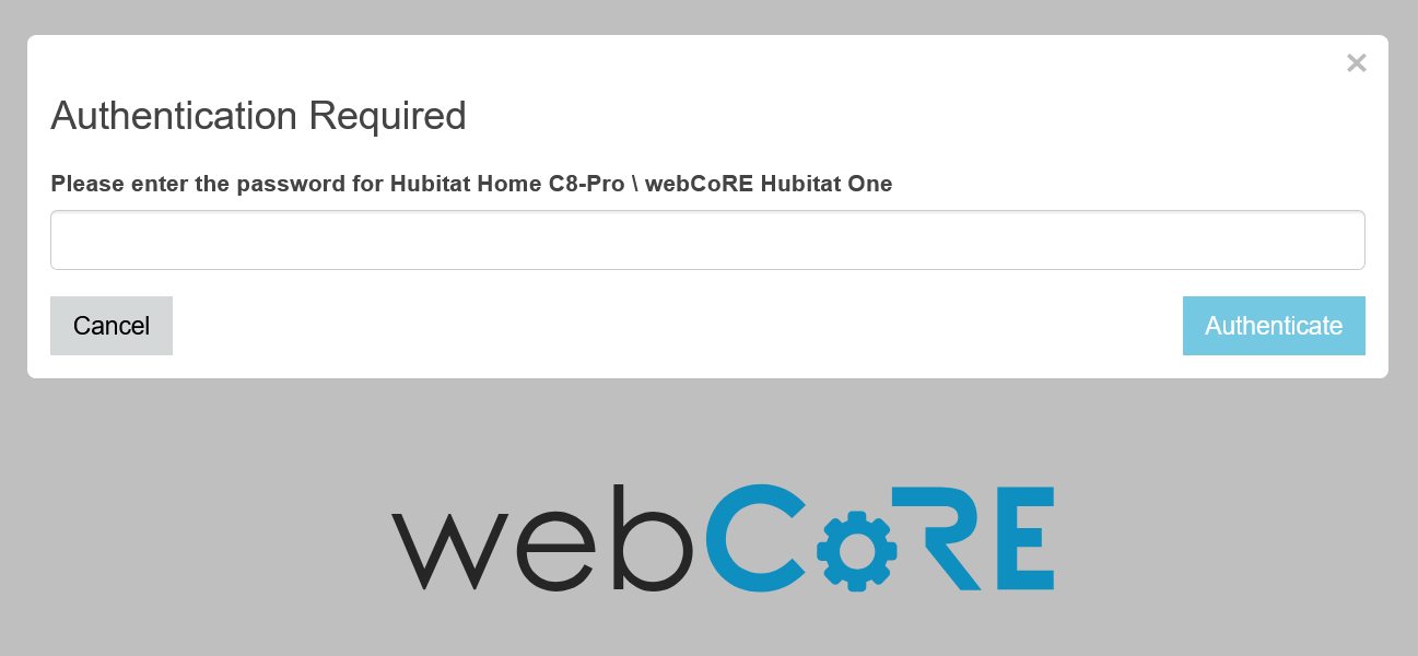 Go to the webcore app within HE and "Register a browser" as noted above. You will get a code that you enter here. You will then need your password to log into webcore.