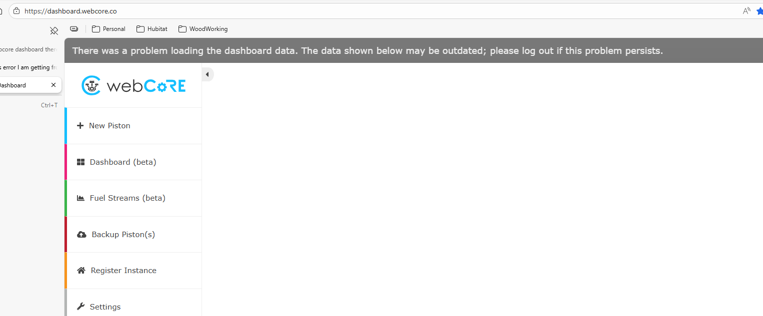 Close that webcore window. Open a new dashboard and register the browser and use that code in the new webcore dashboard.