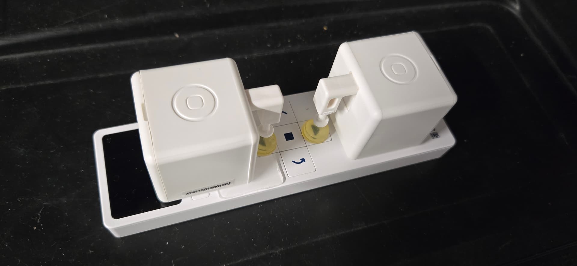 The little yellow dots are stick-on circular cabinet bumpers, as the "fingers" didn't quite reach the surface-flush remote buttons.