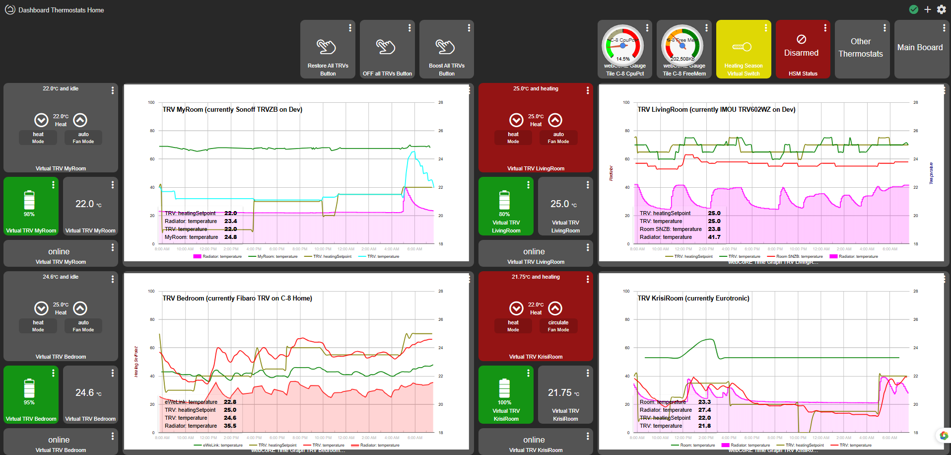 I have configured a complex setup for physical and virtual TRVs, which allows me to easily swap TRVs between different rooms for testing purposes. In each room, I am monitoring the TRV heating setpoint, the TRV temperature, and the temperature of the radiator, as I have placed a temperature and humidity sensor on top of the radiator.