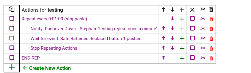 I ran this rule several times, after only 1 message sent (no repetition), after 5 messages sent (4 repetitions), and after 10 messages sent (9 repetitions). The button press always stopped the repeat.