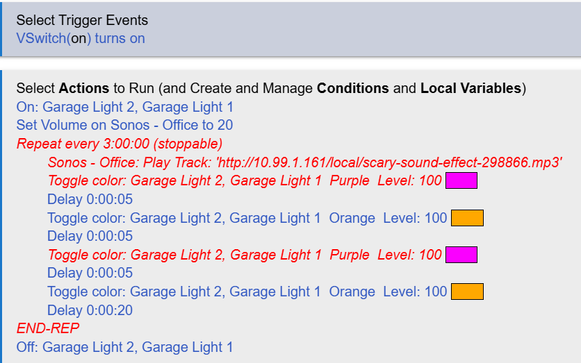 I have two Kasa KL135 bulbs as my two garage lights. I'm working on a Halloween automation which alternates their color from purple to orange. The only way I can get the bulbs to turn orange is to disable the purple commands as shown. I added the delays thinking that might make a difference. With the two purple toggle commands enabled, I never see the bulbs change to orange. Maybe the bulbs need more time to respond?
