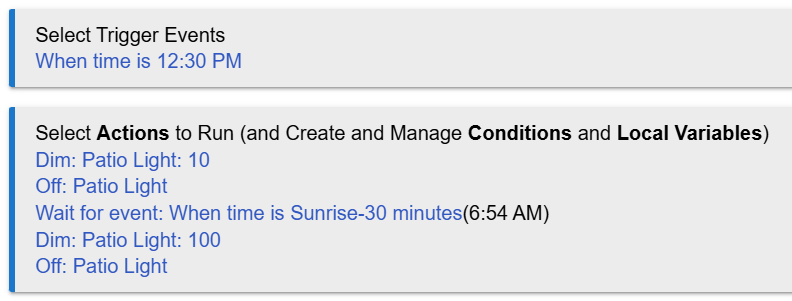 Thanks. but no motion involved. Just setting the light to 10 shortly after bedtime, and back to 100 at sunrise. I was using the patio light for testing. This rule is actually for my bedroom lamp once I get the new smart bulb. Right now I'm using a Kasa outlet.