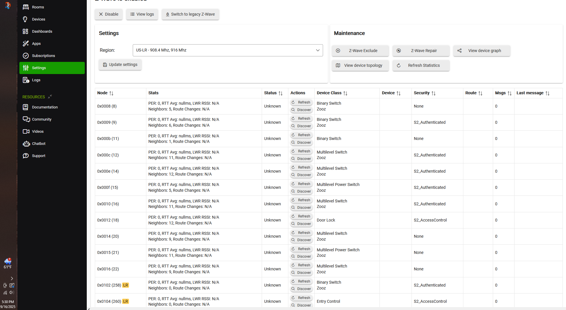 After dinner, an hour later, logs STILL crazy. I exclude/delete the lock. Logs calm down. However, none of the devices work via app (z-wave commands), except for the 10-min-delay-type-behavior. And that's where I am right now.