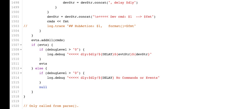 The “delayBetweenLog” method is just a souped up version of delayBetween. The idea is that various DTH commands often need to send multiple commands and multiple events. As always this is accomplished by returning a List of objects as the return parameter from the command. The PE653 Z-Wave device is very time sensitive so you have to be careful not to overrun it. Consequently you need delay statements between the commands. My version still provides this basic functionality but also provides a common logging framework so that uniform log messages are always provided. To achieve this, the delayBetweenLog method must parse the List and take different log specific action depending on the type of each item in the List.