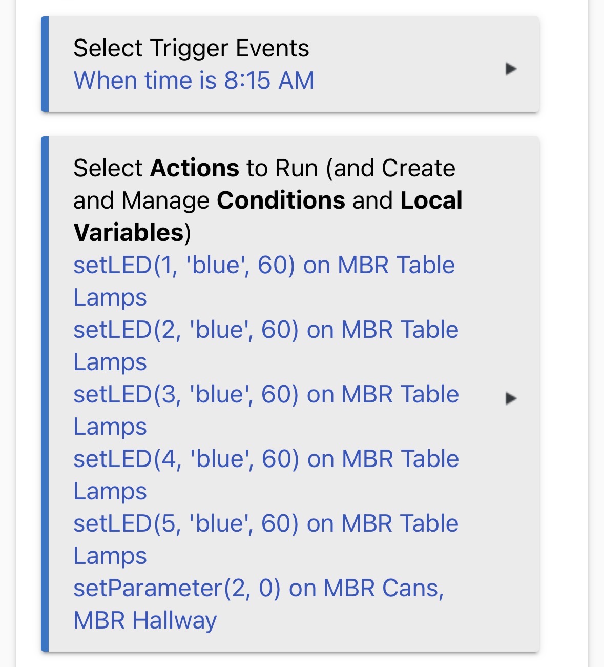 I did find the setLED commands aren’t rock solid so I run the actions twice in the morning to ensure they light up.