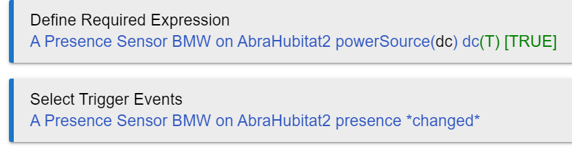 When the car is sitting in the driveway or garage, it's on battery (as noted I'm converting my BMW to be the same as our other car, USB power only when the car is running) so my rule can never run in that state, which will block any openings when the car is sitting in the garage or driveway.