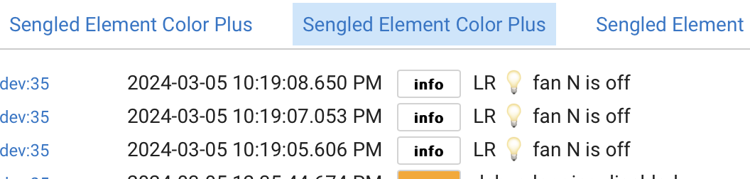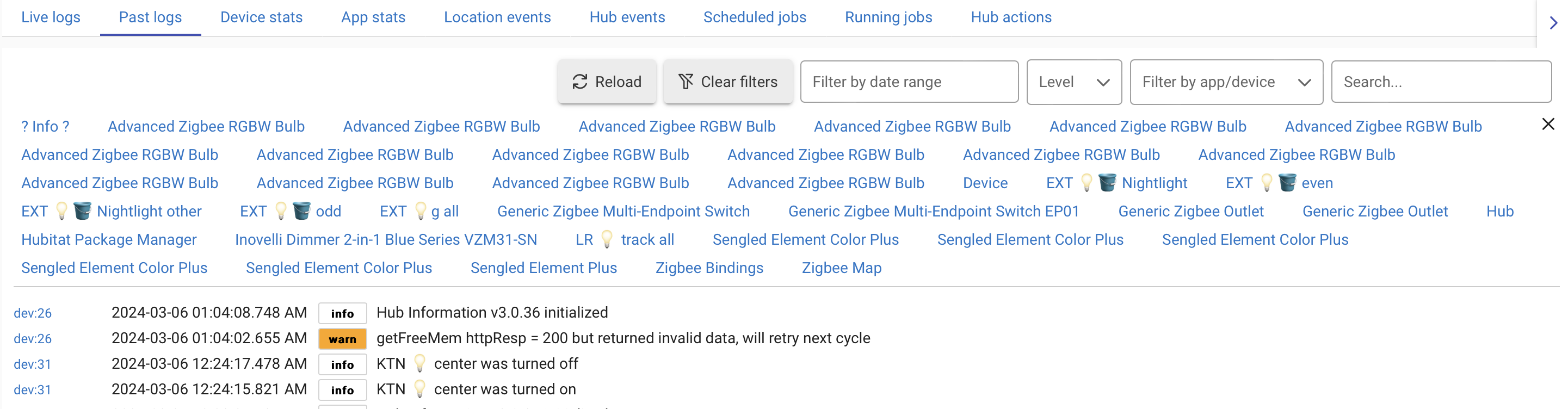 For example, the bound bulb mentioned above is dev31. It is named "KTN center" but in the filter section is it "Advanced Zigbee RGBW Bulb". You can see that all the bulbs are listed the same. The only things showing up correctly are non-Zigbee entries. For example, all the ones with a are groups.