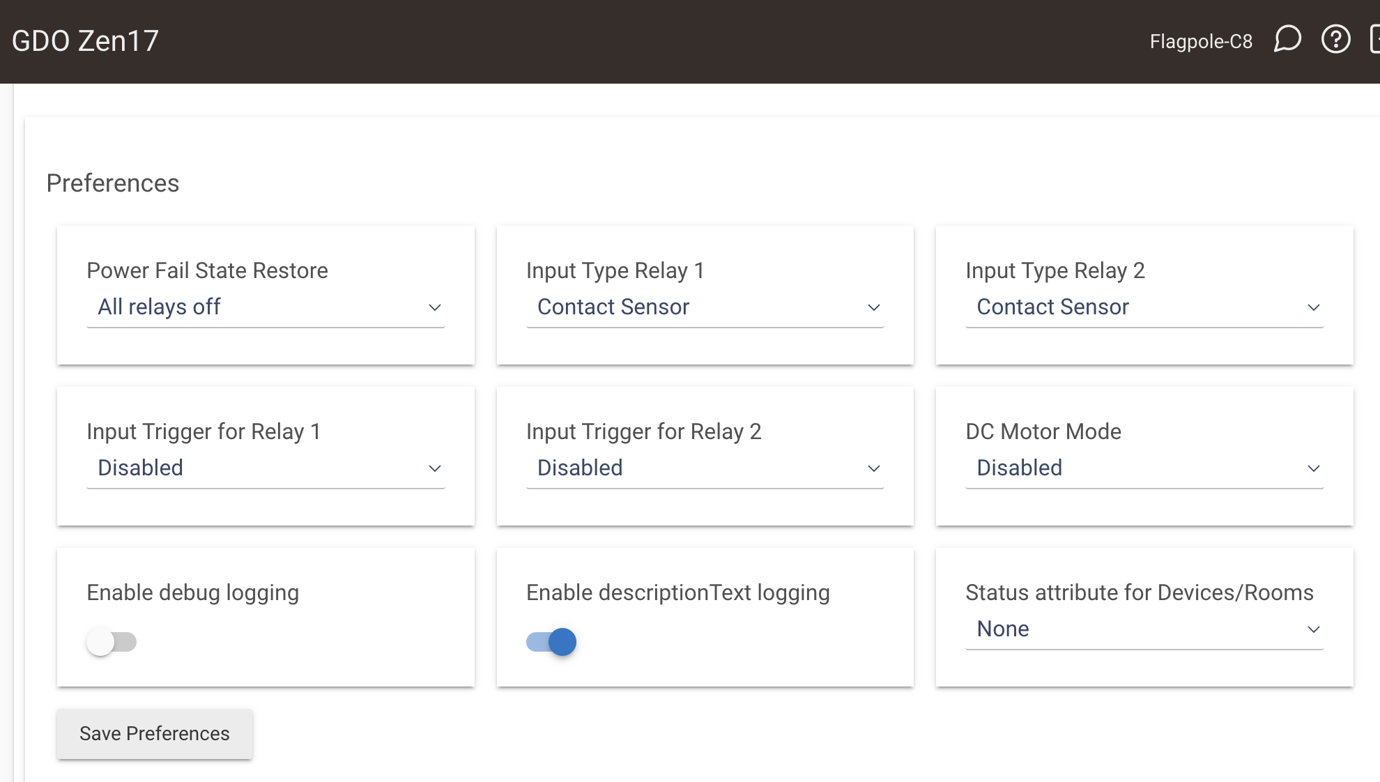 I just have one door (so only using Relay 1), but I am using 2 dumb wired reed sensors to monitor door position (S1 and S2) - here's how my Z17 Prefs look: