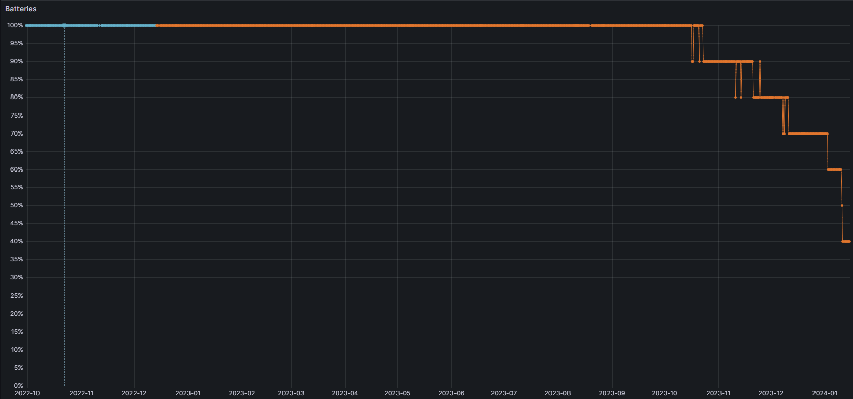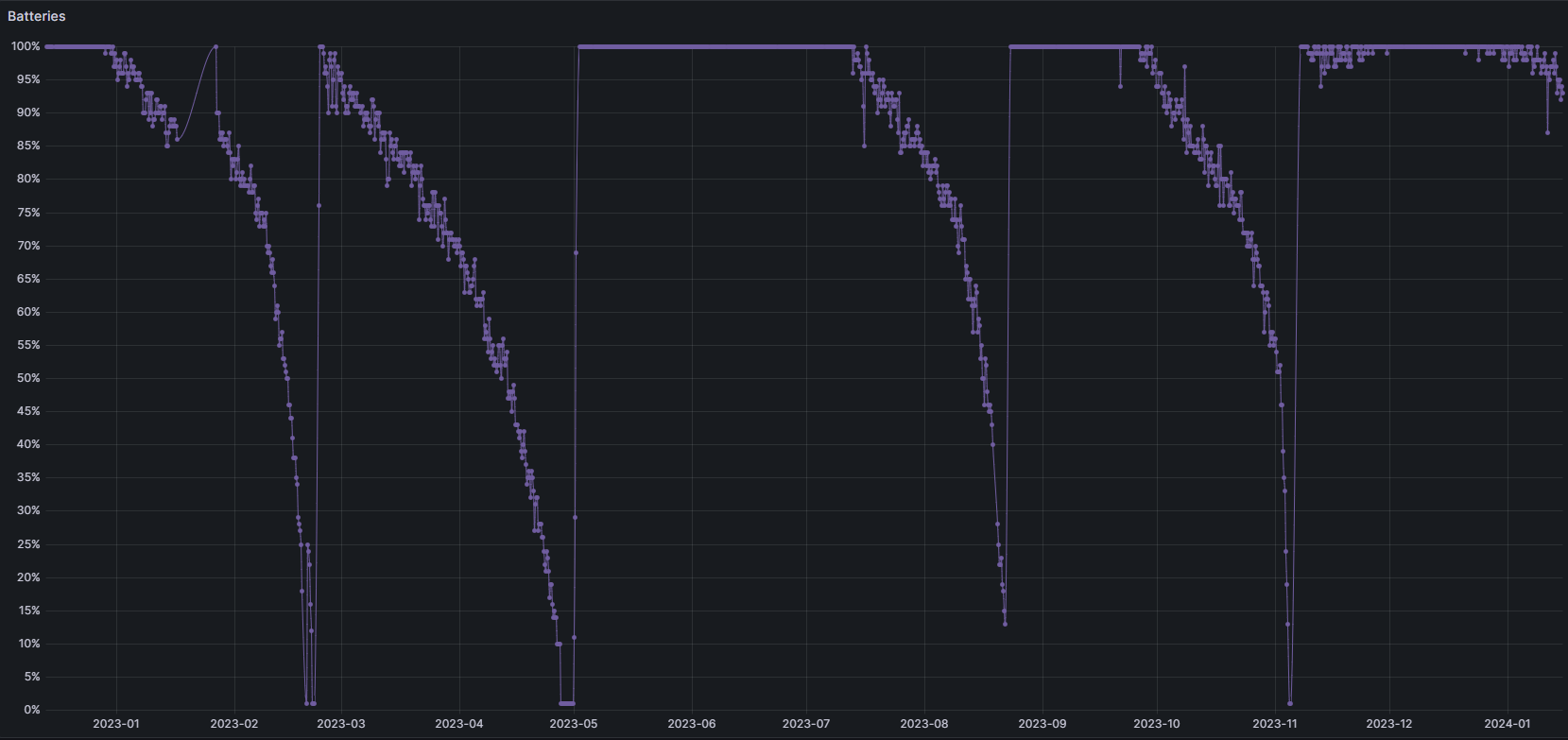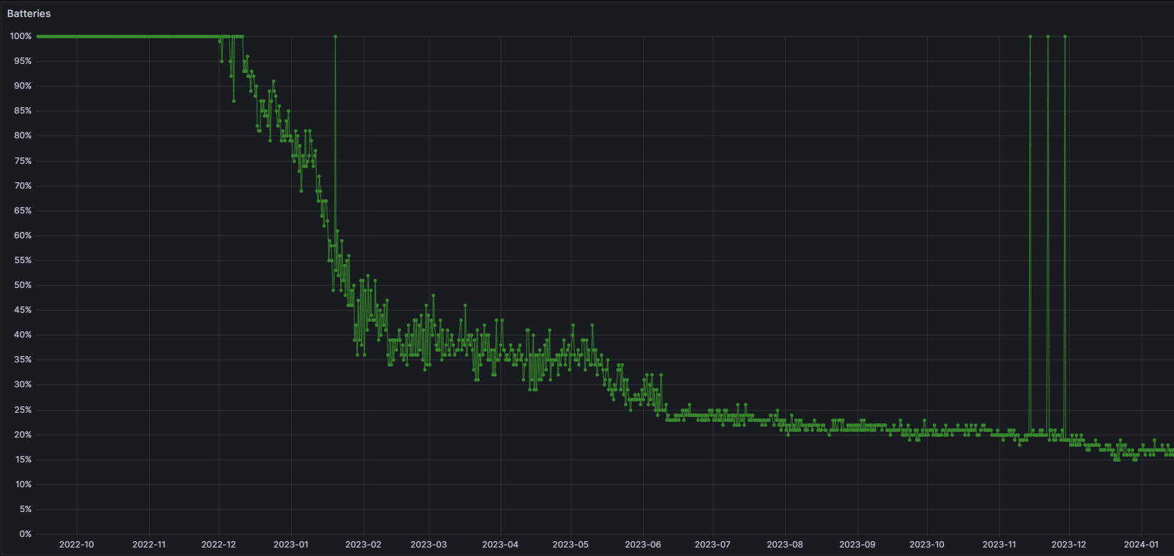 I started with the units in LR mode, using the batteries that came with the unit. In less than a week, the reported battery level dropped from 100% to below 20%, and the units completely stopped reporting shortly thereafter. Figuring that the batteries that came with the units were just bad, I swapped both out for new Energizer batteries, and had a repeat experience of the units dying in less than a week. Interestingly, all four used batteries test out on my Ansmann load tester as 70%.