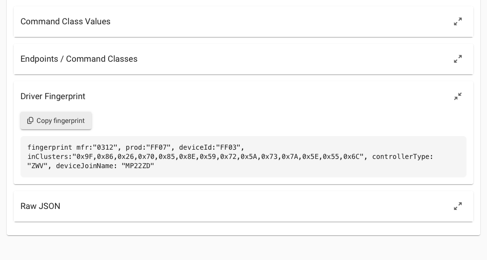 Everything known about a device is here.. Including all current command class values and fingerprint generation.