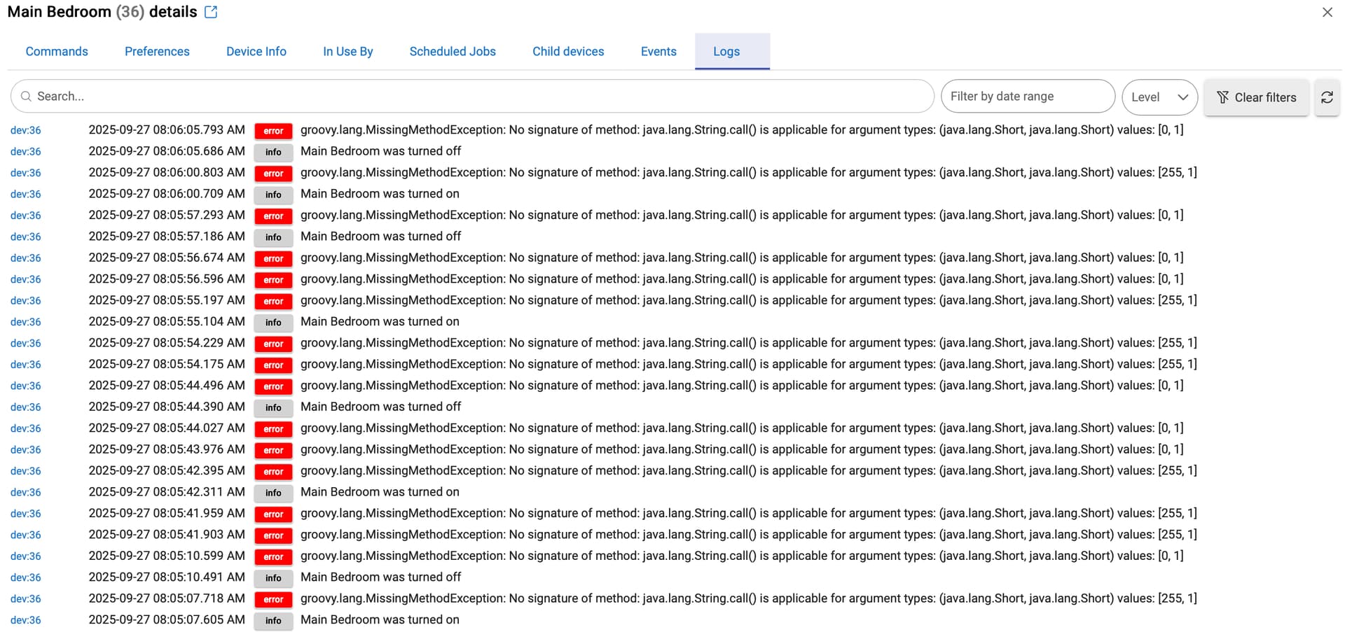 However I am now seeing a ton of errors in the parent device logs: